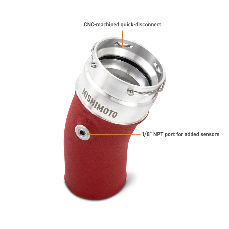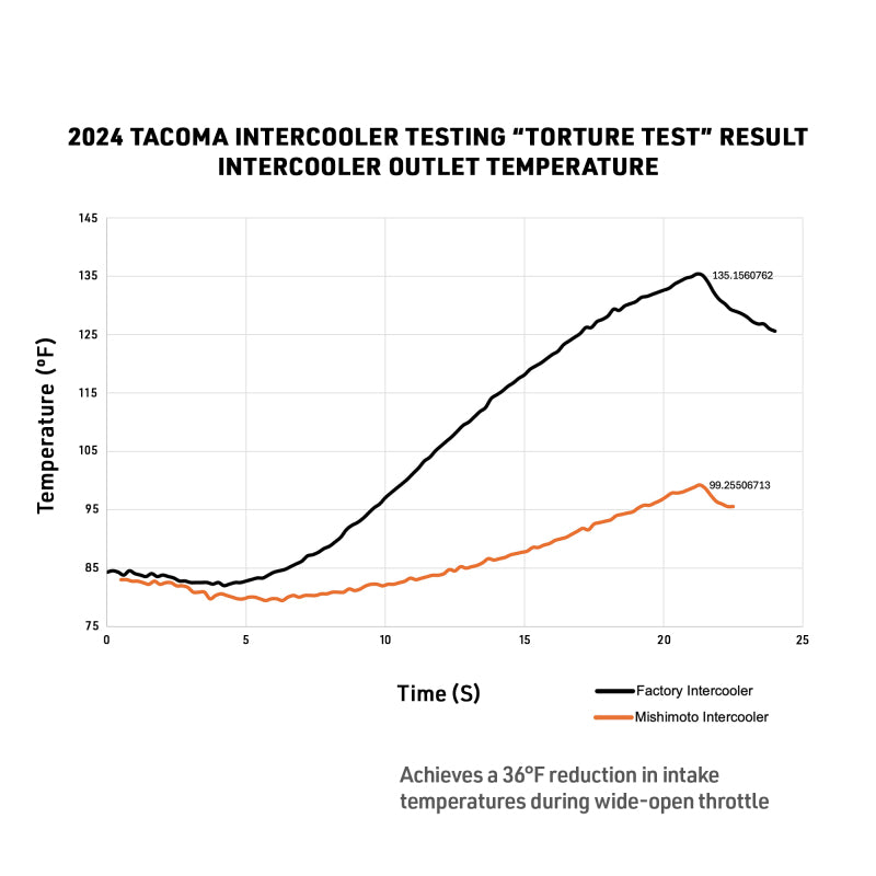 Unlock the full potential of your 2024+ Toyota Tacoma with the Mishimoto Intercooler and Charge Pipes Kit. This system is engineered not just to make power, but to save it when it matters most. Precision-designed to fit within the tight Tacoma engine bay, it maximizes airflow and cooling while reducing strain on your turbo. Whether you're climbing trails, hauling loads, or charging down the highway, this kit keeps intake temps low and reliability high.--The kit’s 55% larger bar-and-plate intercooler core resists heat soak and lowers intake temperatures by 36°F during wide-open-throttle pulls. Reduced pressure drop by 30% means your turbo works less to maintain power, giving smoother low-RPM performance and stronger top-end cooling. Cast end tanks and billet aluminum ports ensure strength and reliable sensor connections, with updated mounting bushings and a new crush washer providing long-term durability.--Customization options include Sleek Silver or Stealth Black intercooler finishes and wrinkle red or wrinkle black charge pipes. The system integrates with OEM and Mishimoto components, including the Mishimoto Performance Aluminum Radiator, for maximum cooling efficiency and future upgrade compatibility. Backed by the Mishimoto Lifetime Warranty, this kit delivers consistent performance, reliable operation, and the confidence to tackle any trail, load, or highway drive.