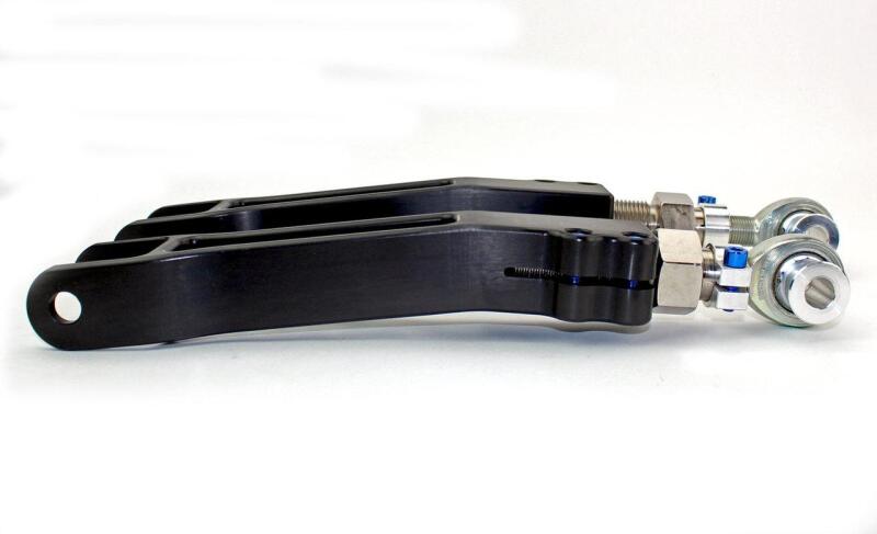 370Z/G37 Rear Camber Links (RLL) allow for an increased range of rear camber adjustment, which is necessary for lowered cars and for performance alignments. These arms are designed for use in high performance street and race vehicles. A lowered 370Z or G37 will need adjustment to get camber back in spec to ensure proper tire wear and handling due to aggressive factory camber curves. Small changes to ride height will affect camber settings.Our latest version of the Rear Camber Arm is machined from Billet 6061-T6 Aluminum and designed to allow for proper sway bar end link clearance. The main arm is slotted to allow the use of pinch bolts with 360 degree rotating clamps on our Double Adjuster so you can precisely and quickly lock down your desired camber settings. No more jam nuts!! Long gone are the days of fumbling with multiple wrenches to tighten jam nuts in place while trying to keep your bearings oriented correctly. Our exclusive 4130 Chromoly Adjuster is CNC gun drilled to reduce weight and Blue Anodized Titanium Hardware shaves even more unsprung weight from the arms, without compromising strength.Pair with our SPL Toe or Mid Links (#SPL RTA Z34/#SPL RML Z34) and our SPL Eccentric Lockout (#SPL EL Z34) kit for total rear camber and toe alignment with "zero-slip".Made in the USA.SPL 370Z/G37 Adjustable Rear Camber Arms Features:• Lightweight Aluminum and Titanium construction• Electroless nickel plated Chromoly Double Adjuster for quick adjustment• Computer Aided Design with the aid of Finite Element Analysis• Rotating clamp design allows for easy access to lock down your alignment settings• Low friction 3 piece Teflon lined FK Heim joints/rod ends