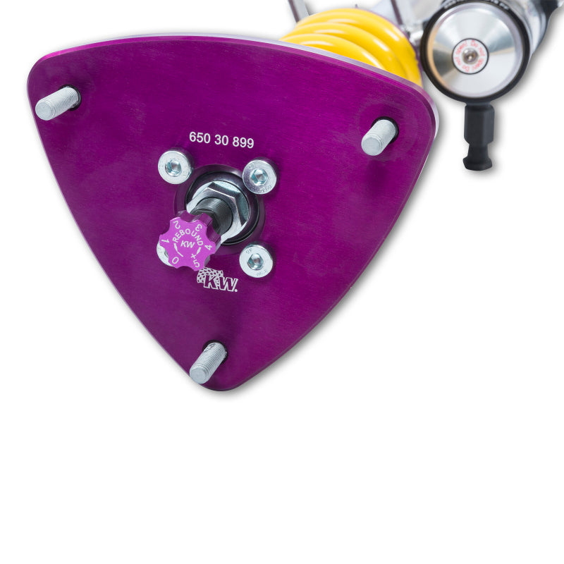 Using the Nordschleife as it's testing grounds and the 7-post rig, KW developed it's V4 Clubsport coilover kit. Wheel loads, vehicle weight and chassis reinforcements (increased body stiffness) can all be taken into consideration with Adjustment -capabilities of the V4 Clubsport. The KW Clubsport coilovers combine KW's high-end racing technology -with maintenance-free KW OEM quality components. Designed to provide you the ideal product to utilize the full potential of your sports car during autocross, track days, high performance drivers education (HPDE) courses, club racing, and is tested rigorously on race tracks such as the Nurburgring Nordschleife. Race teams rely on KW's racing expertise and experience for their vehicle setup. This same championship winning pedigree is mirrored in the development of each one of the KW Clubsport coilover systems. Similar to the KW Competition suspension used in international motorsports, the KW V4 Clubsport coilover kit allows fine tuning of the compression damping separately in the low-speed and high-speed range. The click adjustments of the TVCLH-A valve technology -ake for easy Adjustment -directly on the reservoir. You can modify the low-speed compression damping with 6 precise clicks with the purple low speed Adjustment -ial and directly beneath it the golden Adjustment -heel provides an additional 14 precise clicks of high speed compression adjustment. In addition, the TVR-A technology -provides 16 clicks to noticeably adjust the rebound damping independently of the compression damping. If you would like to adjust the KW V4 Clubsport coilover kit it can easily be adjusted for more comfort or to an alternative setup for a new race track. The KW V4 Clubsport benefits from the same motorsports technology -hat has proven its endurance with multiple overall wins at the ADAC Zurich 24h Nurburgring race.