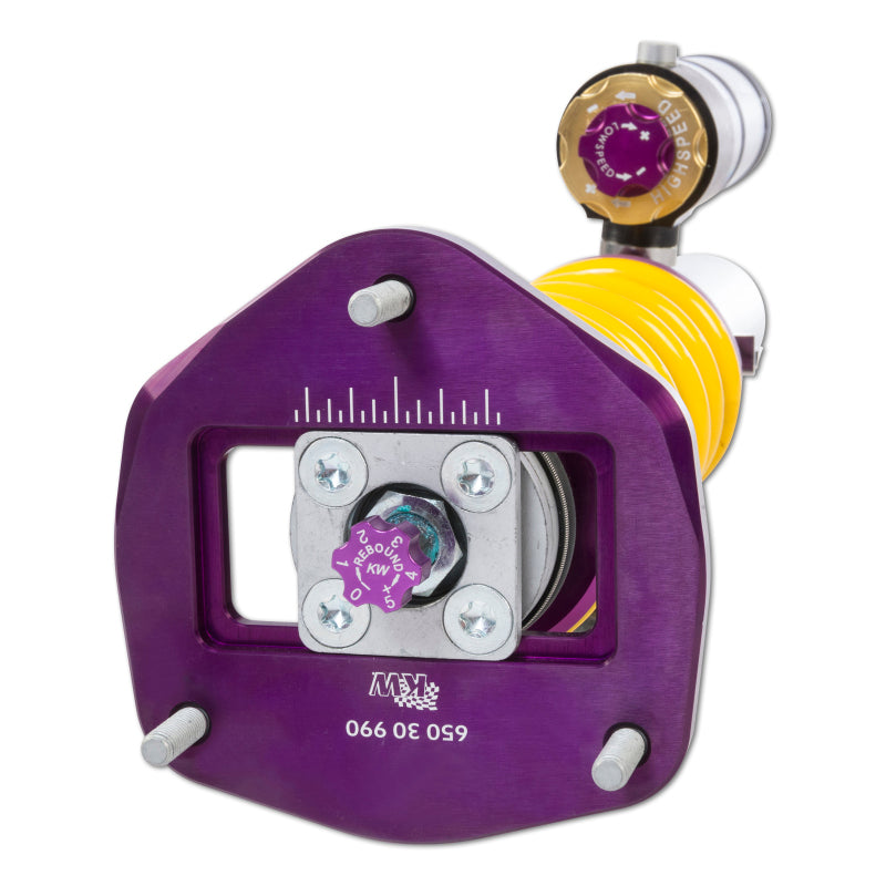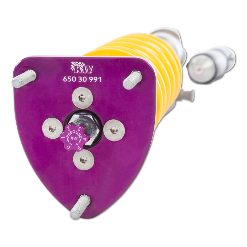 Using the Nordschleife as it's testing grounds and the 7-post rig, KW developed it's V4 Clubsport coilover kit. Wheel loads, vehicle weight and chassis reinforcements (increased body stiffness) can all be taken into consideration with Adjustment -capabilities of the V4 Clubsport. The KW Clubsport coilovers combine KW's high-end racing technology -with maintenance-free KW OEM quality components. Designed to provide you the ideal product to utilize the full potential of your sports car during autocross, track days, high performance drivers education (HPDE) courses, club racing, and is tested rigorously on race tracks such as the Nurburgring Nordschleife. Race teams rely on KW's racing expertise and experience for their vehicle setup. This same championship winning pedigree is mirrored in the development of each one of the KW Clubsport coilover systems. Similar to the KW Competition suspension used in international motorsports, the KW V4 Clubsport coilover kit allows fine tuning of the compression damping separately in the low-speed and high-speed range. The click adjustments of the TVCLH-A valve technology -ake for easy Adjustment -directly on the reservoir. You can modify the low-speed compression damping with 6 precise clicks with the purple low speed Adjustment -ial and directly beneath it the golden Adjustment -heel provides an additional 14 precise clicks of high speed compression adjustment. In addition, the TVR-A technology -provides 16 clicks to noticeably adjust the rebound damping independently of the compression damping. If you would like to adjust the KW V4 Clubsport coilover kit it can easily be adjusted for more comfort or to an alternative setup for a new race track. The KW V4 Clubsport benefits from the same motorsports technology -hat has proven its endurance with multiple overall wins at the ADAC Zurich 24h Nurburgring race.