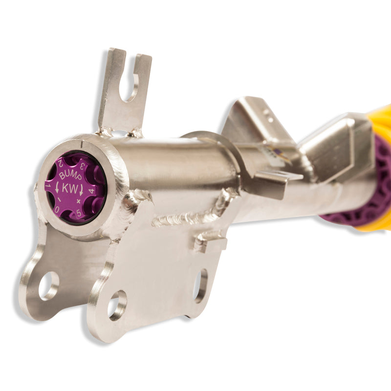 Cutting-edge motorsports technology for more performance on the road. Like every suspension product developed by KW automotive, the suspension manufacturer, and manufactured in Germany, the KW V3 Coilover suspension kit also provides a significant plus in safety reserves in road traffic. Thanks to the chassis with its high-quality dampers, springs, and elastomer spring elements, pitching and rolling movements during load changes such as evasive maneuvers, cornering, acceleration, and braking are significantly reduced. The braking distances are also shortened. Thanks to improved support and feedback, drivers not only feel safer but driving in everyday life becomes even safer. With compression and rebound stage damping, that can be set separately and independently of each other, the damper setup can be customized to your personal driving preferences or vehicle changes such as weight, tire characteristics, or altered vehicle rigidity. True performance optimization is only possible with this unique, patented system. For example, this allows the compression damping force to be increased and get more grip from the tires, to improve cornering behavior and reduce squat without simultaneously altering the rebound stage damping which is optimally matched to the spring rate, a scenario which results in reduced grip and the associated loss of performance. The KW V3 coilover kit is the ideal tool for performance-oriented drivers and experienced tuning enthusiasts who place a strong emphasis on the overall performance of their suspension. The Variant 3 features patented TVR-A and TVC-A technology that provides separately adjustable rebound and compression damping. The extensive adjustment range of the independently configurable rebound and compression make it easy to directly influence the steering behavior, directional stability, grip and handling characteristics for confident and repeatable results at the limit of driving dynamics.