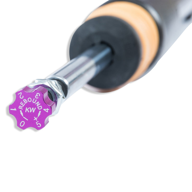 KW V2 INOX-LINE coilovers are the perfect solution for drivers who want more than just outstanding looks and adjustable ride height. In addition to stainless steel coilover struts, and corrosion-resistant components built for long term durability, KW V2 coilovers utilize TVR-A (Twin Valve Rebound - Adjustable) technology that allow Adjustment of the rebound damping characteristics with 16 clicks so you can fine tune the ride comfort or performance to your satisfaction. As with all KW coilovers our engineers develop vehicle specific damper settings that undergo comprehensive testing on the Nurburgring Nordschleife and in our KW 7-post Driving Dynamic Test Center. With a KW coilover kit the driving experience is more dynamic and direct. With the rebound adjustability you have a more direct influence on the handling or comfort of the car. With 16 precise clicks you can adjust the KW dampers (more firm or more comfortable) without affecting the compression damping fine-tuned by our engineers. The two-stage, patented TVR-A (Twin Valve Rebound - Adjustable) technology enables a small volume of oil flow through an adjustable, conically shaped, low-speed bypass during low damper speeds, while at high damper speeds, the main rebound stage valve opens allowing a larger volume of oil to flow. This provides a big improvement in terms of ride comfort without influencing the high-speed range. There are 16 precise clicks available for individual settings, so you can choose between more comfort or more body control. With KW V2 coilovers you can achieve maximum lowering within an approved lowering range that ensures a proper functioning suspension and adequate travel after your car is lowered. Even after years of use you can easily adjust the ride height thanks to the dirt resistant trapezoid thread and composite adjustment collar.