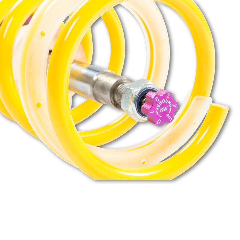 Cutting-edge motorsports technology for more performance on the road. Like every suspension product developed by KW automotive, the suspension manufacturer, and manufactured in Germany, the KW V3 Coilover suspension kit also provides a significant plus in safety reserves in road traffic. Thanks to the chassis with its high-quality dampers, springs, and elastomer spring elements, pitching and rolling movements during load changes such as evasive maneuvers, cornering, acceleration, and braking are significantly reduced. The braking distances are also shortened. Thanks to improved support and feedback, drivers not only feel safer but driving in everyday life becomes even safer. With compression and rebound stage damping, that can be set separately and independently of each other, the damper setup can be customized to your personal driving preferences or vehicle changes such as weight, tire characteristics, or altered vehicle rigidity. True performance optimization is only possible with this unique, patented system. For example, this allows the compression damping force to be increased and get more grip from the tires, to improve cornering behavior and reduce squat without simultaneously altering the rebound stage damping which is optimally matched to the spring rate, a scenario which results in reduced grip and the associated loss of performance. The KW V3 coilover kit is the ideal tool for performance-oriented drivers and experienced tuning enthusiasts who place a strong emphasis on the overall performance of their suspension. The Variant 3 features patented TVR-A and TVC-A technology that provides separately adjustable rebound and compression damping. The extensive adjustment range of the independently configurable rebound and compression make it easy to directly influence the steering behavior, directional stability, grip and handling characteristics for confident and repeatable results at the limit of driving dynamics.