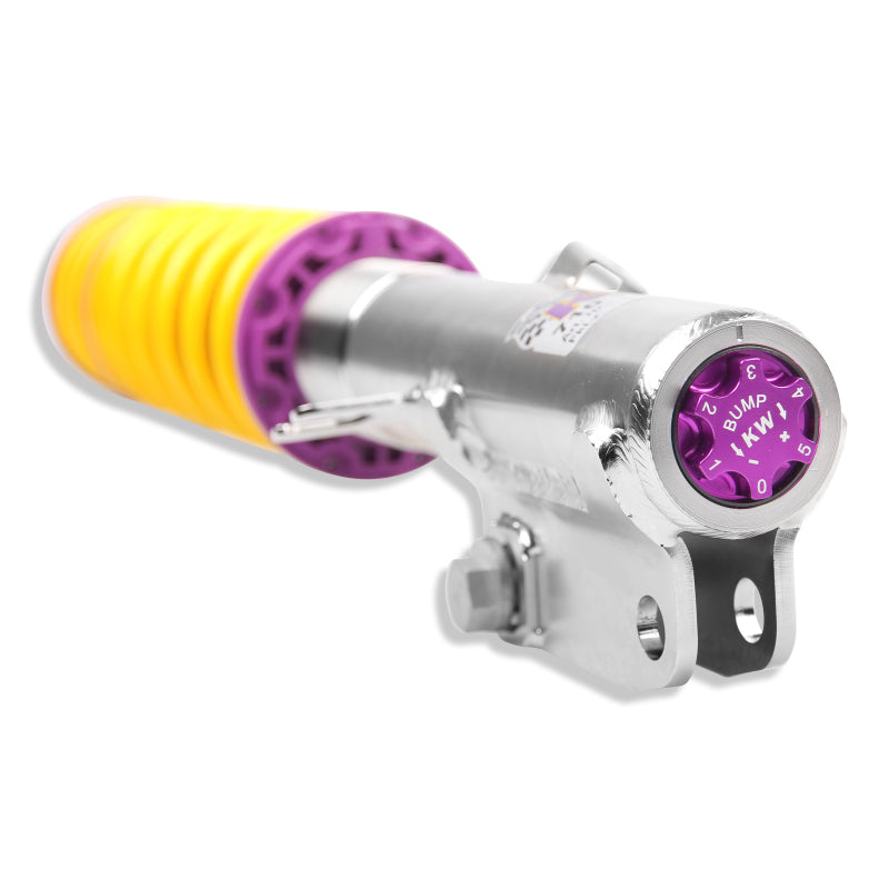 Cutting-edge motorsports technology for more performance on the road. Like every suspension product developed by KW automotive, the suspension manufacturer, and manufactured in Germany, the KW V3 Coilover suspension kit also provides a significant plus in safety reserves in road traffic. Thanks to the chassis with its high-quality dampers, springs, and elastomer spring elements, pitching and rolling movements during load changes such as evasive maneuvers, cornering, acceleration, and braking are significantly reduced. The braking distances are also shortened. Thanks to improved support and feedback, drivers not only feel safer but driving in everyday life becomes even safer. With compression and rebound stage damping, that can be set separately and independently of each other, the damper setup can be customized to your personal driving preferences or vehicle changes such as weight, tire characteristics, or altered vehicle rigidity. True performance optimization is only possible with this unique, patented system. For example, this allows the compression damping force to be increased and get more grip from the tires, to improve cornering behavior and reduce squat without simultaneously altering the rebound stage damping which is optimally matched to the spring rate, a scenario which results in reduced grip and the associated loss of performance. The KW V3 coilover kit is the ideal tool for performance-oriented drivers and experienced tuning enthusiasts who place a strong emphasis on the overall performance of their suspension. The Variant 3 features patented TVR-A and TVC-A technology that provides separately adjustable rebound and compression damping. The extensive adjustment range of the independently configurable rebound and compression make it easy to directly influence the steering behavior, directional stability, grip and handling characteristics for confident and repeatable results at the limit of driving dynamics.