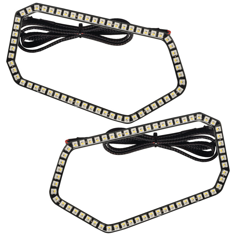 Introducing the ORACLE Lighting Dynamic ColorSHIFT(tm) RGB+W Headlight Halo Kit for the 2008-2019 Polaris RZR 570/800/900 models. The new ORACLE Lighting Dynamic ColorSHIFT(tm) Halos feature individually addressable LEDs which pack a ton of unique features. The Dynamic features allow the user to run multiple moving color patterns through the LEDs, creating a vivid eye-catching lighting effect. This complete LED Halo kit includes everything you need to install and operate the halos on your rig. These RGBW halos feature our traditional RGB ColorSHIFT(tm) technology along with an extra "White LED" which allows for truer white tones, a crisp white DRL color option and the ability to instantly switch over to DRL mode. App Control: Through the App you can easily make standard white colors as well as any static colors using the LED color wheel. What makes these DYNAMIC halos more unique is that you can also display a variety of moving patterns within the app. With over 200 different patterns there is something to fit every color scheme you can imagine! Installation: Installation is very easy thanks to the IP67 waterproof characteristics of the Halos, these LEDs are completely encapsulated in a waterproof resin which makes them completely waterproof and allows them to be installed onto the outside of the lens. This makes installation easy even for a beginner. Wiring: Wiring is now easy with the plug-and-play connectors. Simply plug the halos into the LED driver and connect to + and - to the battery. Then you just turn on the app and connect to the controller. Give your UTV the attitude you've always wanted it to have, with the new ORACLE ColorSHIFT(tm) RGB+W Headlight Halo Kit!