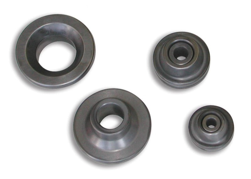 This 3 piece set includes: 3.0", 3.5", 4.0" - Often called "dimple dies", flared hole dies are used in sheet-metal fabrications to provide rigidity and strength to flat, unsupported panels. Due to the resulting high strength -to-weight ratio applications promoted by the use of this technique, flared holes are found in many aircraft and race vehicles designs. Beginning with comprehensive finite element analysis supported by extensive prototype testing, our Flared Hole Dies are engineered to provide the optimum combination of performance attributes: *Designed to eliminate edge tearing even when used on high strength 4130 chromoly sheet (normalized condition), with laser cut holes (hardened edges) *Optimized form (flare angle, bend radius and length of run) provides maximum stiffness and strength *Manufactured from premium hardened high carbon steel for maximum tool life *Unique shape for ease of handling *Up to max sheet thickness of .090 for chromoly and .125 for mild steel. California Residents WARNING