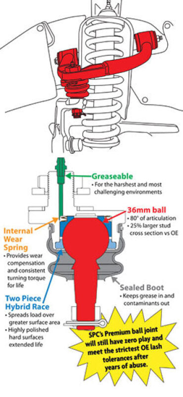Isuzu D-Max and second-generation Chevy Colorado trucks run out of factory camber and caster adjustment when they are lifted. SPC's heavy duty cast replacement arms provide 0deg to +4deg caster change and +-3deg camber change. SPC's patented truck arms offer increased droop travel and free pivoting bushings in an easy to align remove and replace arm. Featuring our long life maintainable ball joint and SpecRide bushings, this arm is designed to correct alignment angles while maintaining factory ride quality. These remove and replace arms are available in pairs for lifted and off-road applications. Get more droop travel: SPC's arm has improved clearance ot get around the spring bucket when the arm droops, eliminating arm to frame contact on lifted trucks. The maintainable ball joint has an oversized ball and allows more than 80deg of articulation to ensure it never binds. SpecRide bushings have free pivot to eliminate any chance of bushing failure seen on many high travel suspensions. Get your drivability back: When you lift your truck you affect caster and camber. SPC's arms have +1deg of caster built into them. Using its patented ball joint design the arm will get you 0deg to +4deg of caster and +-2deg of camber. Get your tire where you wantit in the wheel well: Use adjustment in the control arm and on the OE lower cams to maximize alignment angles and move oversized tires forward in the wheel well to minimize or avoid fender trimming. California Residents WARNING